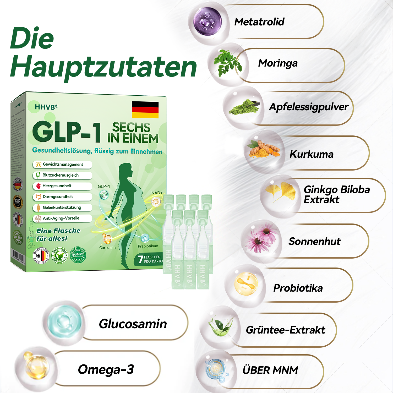 HHVBยฎ GLP-1 SIX IN-ONE Health Solution Oral Liquid wurde von einem Team von รผber 30 internationalen Experten fรผr Endokrinologie und Diabetologie nach mehr als drei Jahren Forschung entwickelt. Es kombiniert Meglutid mit starken pflanzlichen Inhaltsstoffen, um den Stoffwechsel anzukurbeln, die Fettverbrennung zu beschleunigen und die Verdauungs- und Lymphgesundheit zu unterstรผtzen. Diese orale Lรถsung wurde vom BfArM auf ihre Sicherheit und Wirksamkeit geprรผft und bietet eine wissenschaftlich fundierte Lรถsung fรผr Gewichtsreduktion und allgemeines Wohlbefinden.